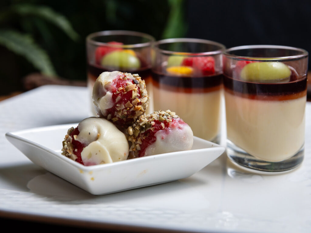 - Postre: Mousse de maracuyá sin azúcar añadida sobre crocante de almendra, o panna cotta de coco con frutos rojos.